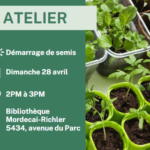 Atelier: Démarrage de semisAtelier: Démarrage de semis Dimanche 28 avril 2024 de 14 h 00 à 15 h 00 La réalisation de vos propres semis est si simple et agréable. Sans compter que lorsque les pousses commencent à poindre, vous ressentirez la satisfaction du travail bien fait […]