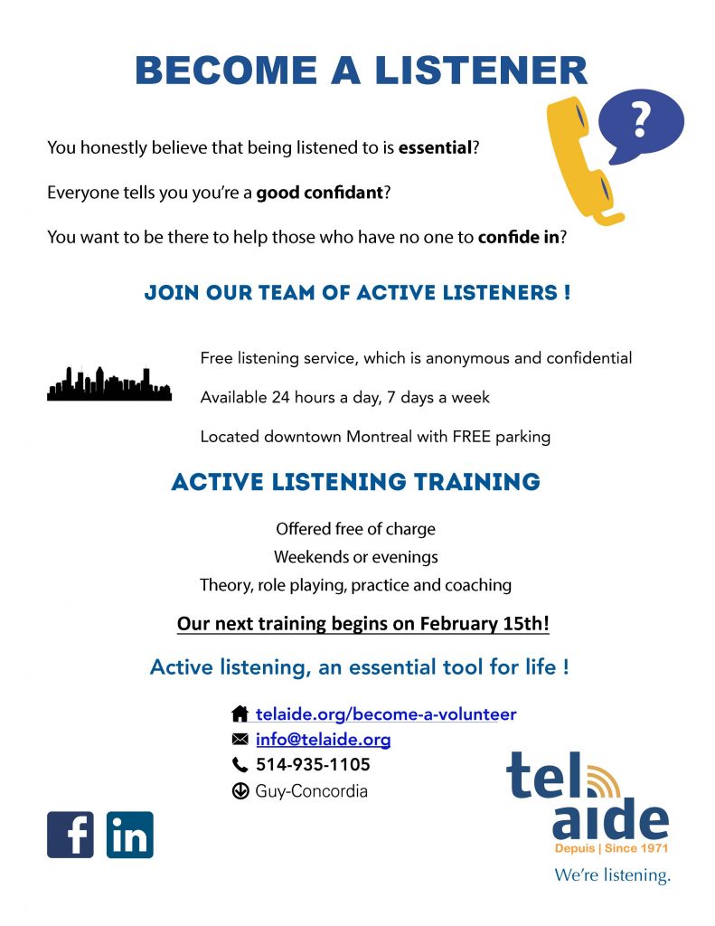 Tel Aide provides a non judgemental, confidential, empathic and anonymous active listening phone service 24 hours a day 7 days a week. We train our volunteers in techniques of active listening that are recognized by 911, 811, 211, CLSCx, and social workers as an important resource for their clients. We are putting out a call for volunteers, that we will train to be active listeners, to be helpful to our neighbours in their hour of need.