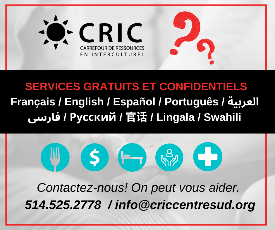 Are you an immigrant? Do you need to better understand the services available to you and your family? Do you have questions about how Quebec’s society functions? Contact the CRIC to book a free, confidential accompaniment offered in your native language.