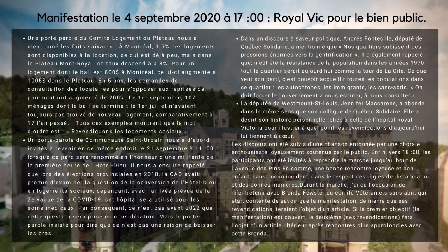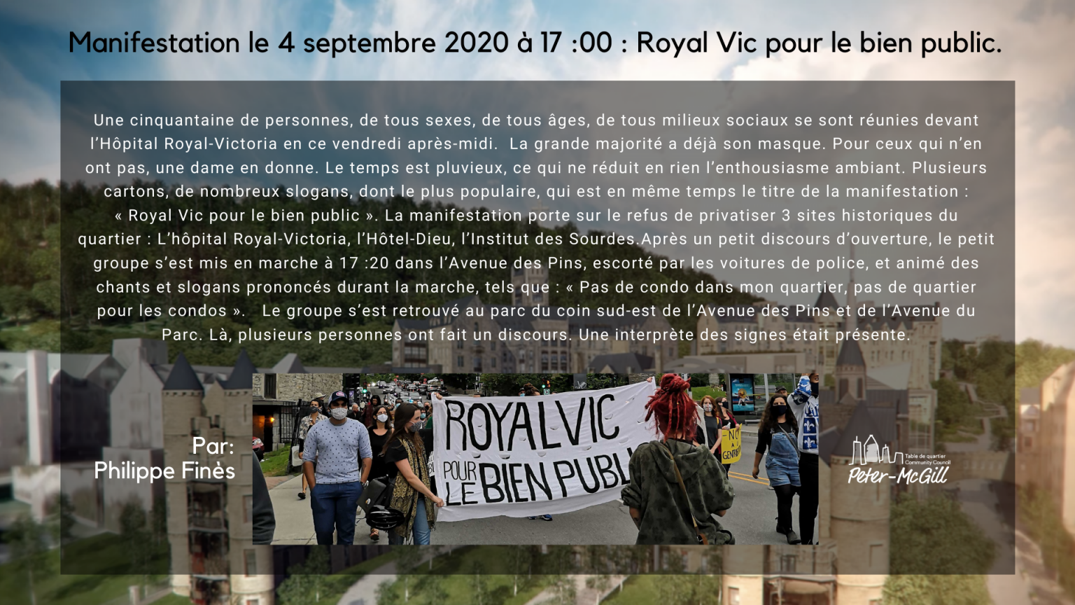 Une cinquantaine de personnes, de tous sexes, de tous âges, de tous milieux sociaux se sont réunies devant l’Hôpital Royal-Victoria en ce vendredi après-midi. La grande majorité a déjà son masque. Pour ceux qui n’en ont pas, une dame en donne. Le temps est pluvieux, ce qui ne réduit en rien l’enthousiasme ambiant. Plusieurs cartons, de nombreux slogans, dont le plus populaire, qui est en même temps le titre de la manifestation : « Royal Vic pour le bien public ». La manifestation porte sur le refus de privatiser 3 sites historiques du quartier : L’hôpital Royal-Victoria, l’Hôtel-Dieu, l’Institut des Sourdes.