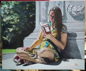 A word from the painter: “One day I went downtown at lunch time and in the park I saw people sitting on the chair set on the grass and under the statue from the office enjoying the fresh air and sunshine. I recorded this moment on my cell phone. This is the background of my creation.” – Jacky Lee