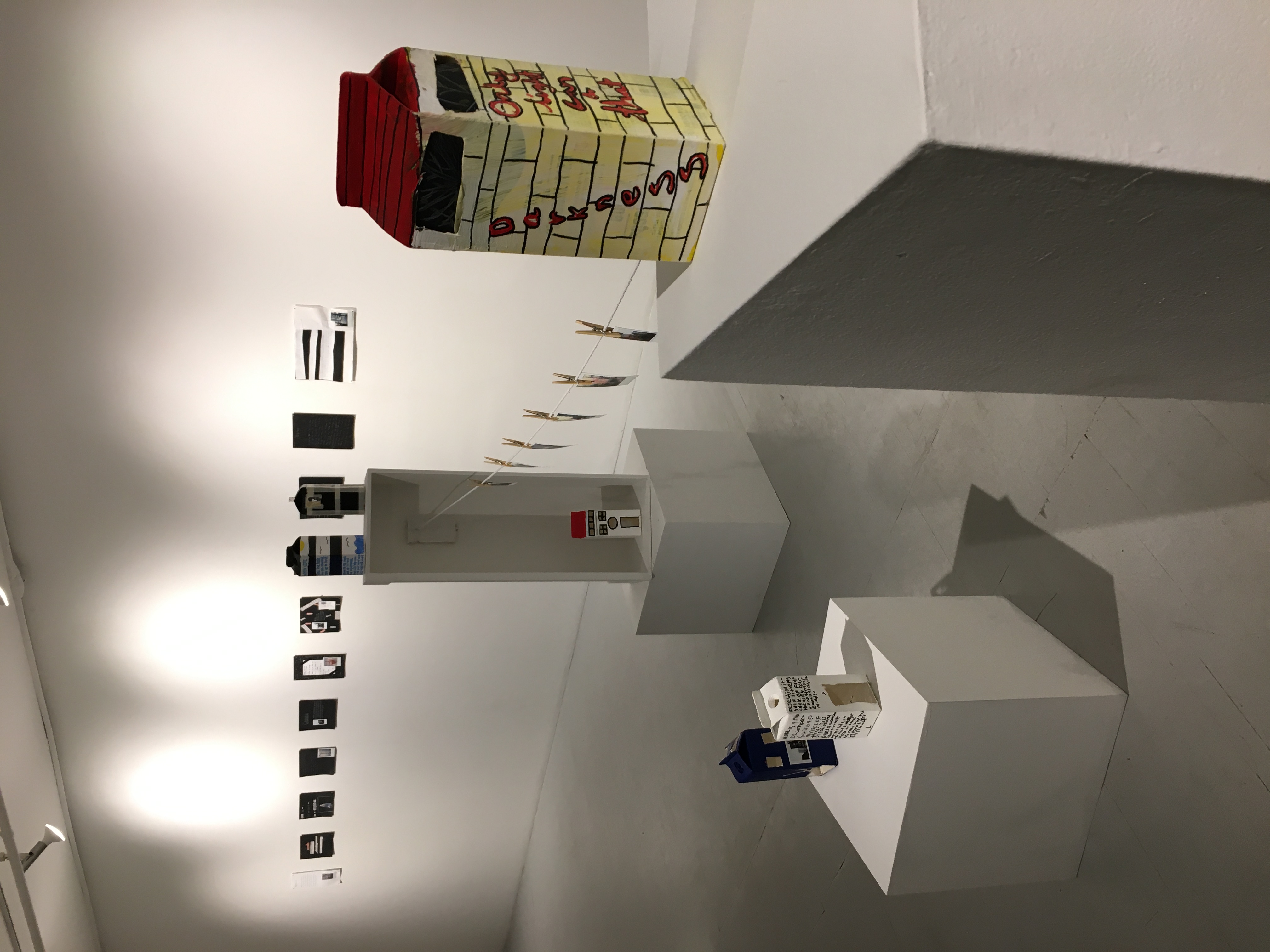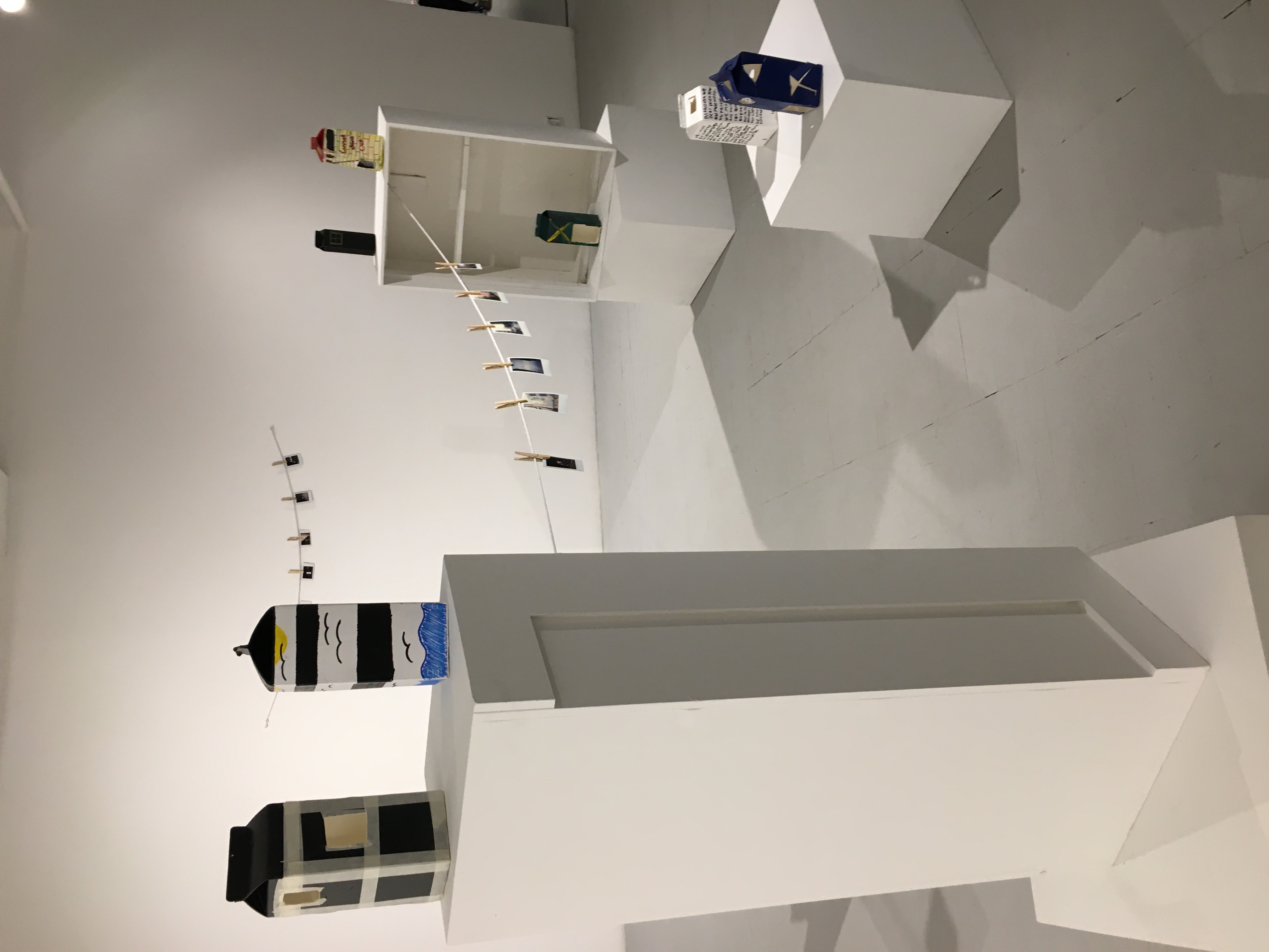 A ma gauche, des Polaroids plus grands, suspendus sur une corde à linge, avec des pinces-linge en bois, reliant deux ‘immeubles’, des berlingots aussi! Ces ‘immeubles’ sont décorés de graffitis, certains lisibles, d’autres pas; des fenêtres découpées par-ci par-là complètent le tout!