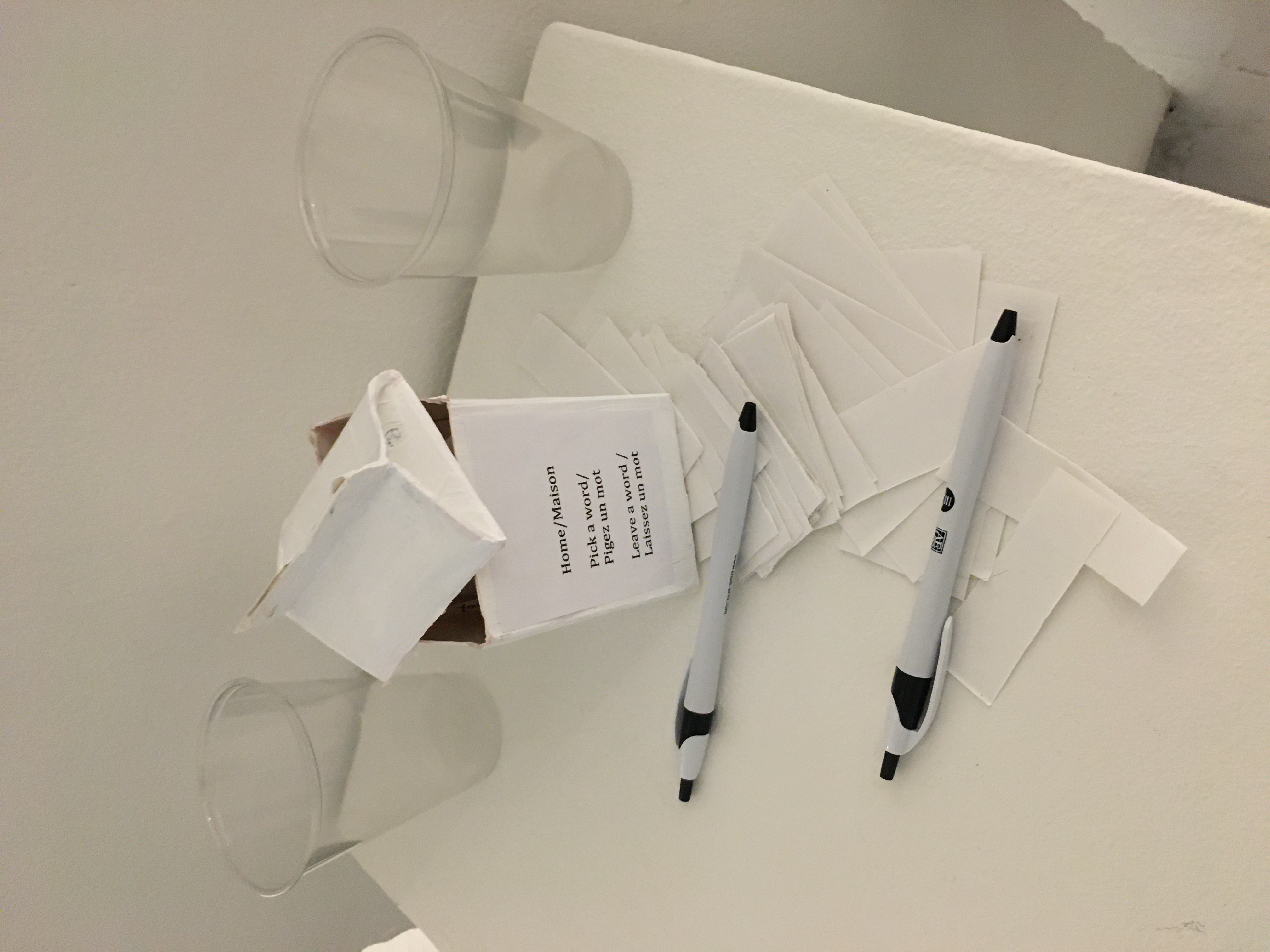 Dans le centre de l’espace d’exposition, se trouvait une discrète et mystérieuse petite boîte qui nous invitait à échanger les petits billets qu’elle contenait avec les nôtres.