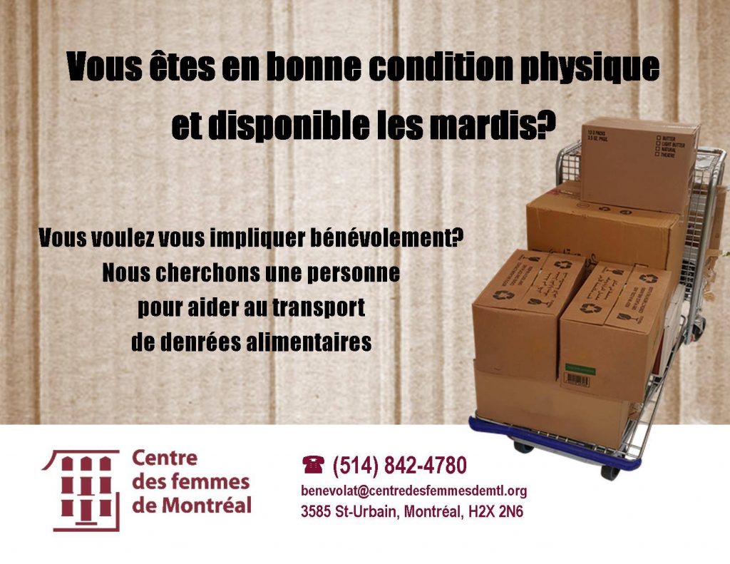 Nouvelles du Centre des femmes Recherche d’un(e) aide chauffeur(euse)-bénévole les mardisLe Centre des femmes de Montréal est à la recherche d’un(e) aide-chauffeur(euse) bénévole les mardis.Mardi durant la journéeAu Centre des femmes de Montréal, 3585 rue Saint-UrbainInfos : Céline, 514 842-4780 ou benevolat@centredesfemmesdemtl.org