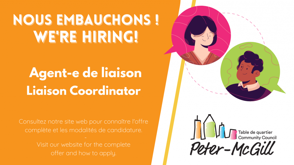 La Table de quartier Peter-McGill veut vous rencontrer. Le/la candidat.e recherché.e aura pour principal mandat d’animer la vie associative auprès des partenaires et résidents, soutenir les bénévoles, promouvoir la Table de quartier, et animer les réseaux sociaux de l’organisme. Il ou elle sera une personne clef au sein d’une équipe dynamique et engagée.