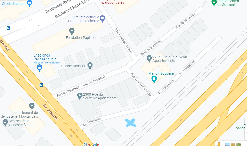 Pour se rendre à la ruelle Hawarden, il suffit de descendre Lambert Closse jusqu’au bout de la rue tout simplement ! Le X bleu représente le nouvel espace.